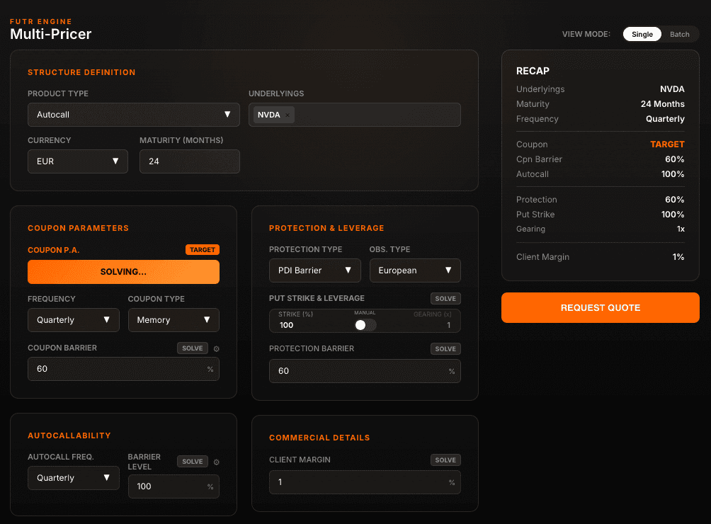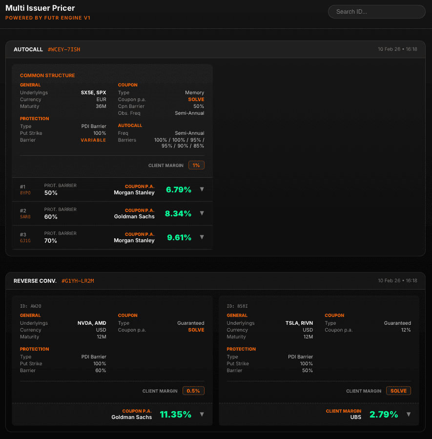 FUTR multi-issuer pricing engine delivers reliable indicative prices across multiple banks in real-time. Built on modern technology, the platform is designed to continuously evolve and integrate an expanding range of vanilla products.
