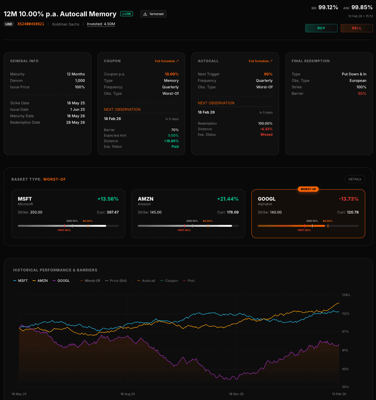 Every product detail at your fingertips, from vanilla to exotic structures. Our lifecycle view displays all product mechanics and performance data in one intuitive interface—no need to dig through termsheets. Automated event notifications keep you informed of coupons, autocalls, maturities, and key triggers across your entire structured products portfolio.