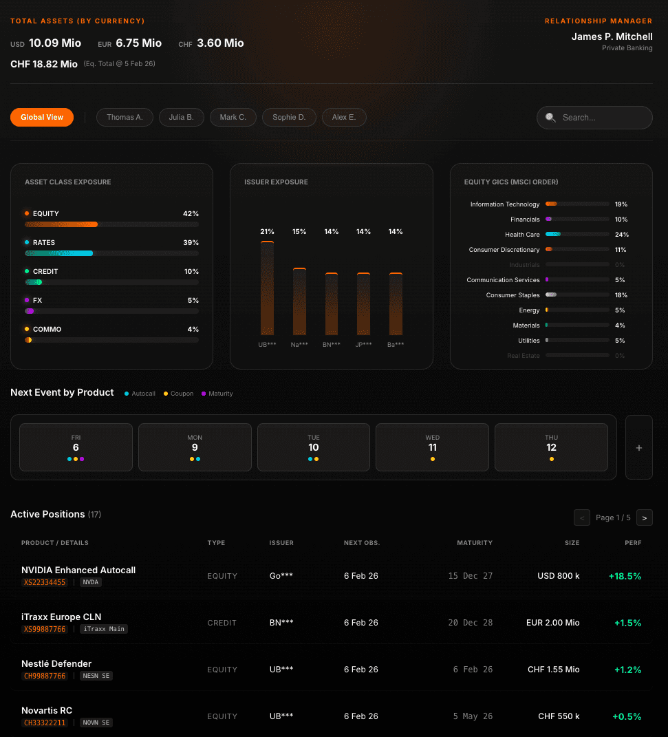 Complete visibility and control over your structured products. Our portfolio monitoring platform gives you real-time access to all your positions, upcoming events, and detailed analytics. Track exposures by asset class, sector, and currency. Filter by sub-clients to generate precise white-label reports. An intuitive interface built on cutting-edge technology.